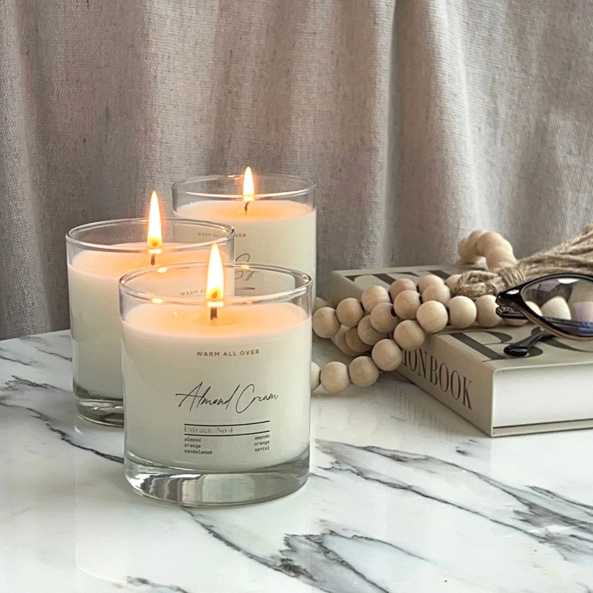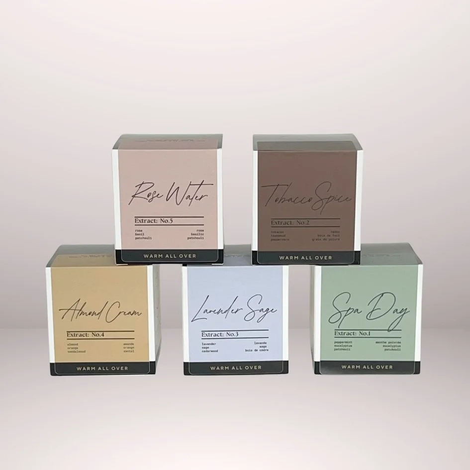 Spa Day to relax and focus, Tobacco Spice for an everyday elevated home scent, Lavender Sage for calm, Rose Water for an elegant clean, soft floral or Almond Cream for a hint of warm cookies.